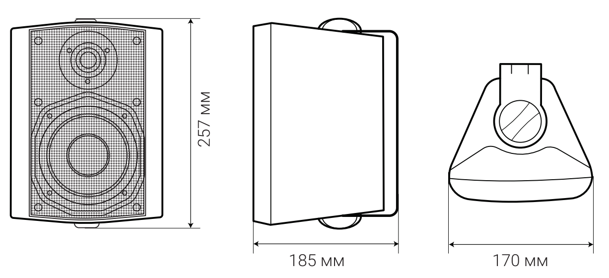 Применяется для воспроизведения звуковой трансляции: музыка или речь. Два динамика: НЧ-вуфер 5" + твитер ВЧ 1,5". Диапазон рабочих частот 100 Гц - 20 кГц, SPL 92 дБ. Подключение к линиями 70/100В или 8Ом, мощность 30 Вт (8Ом) и 7.5/15/30 Вт (70/100В). Настенный монтаж на кронштейн в комплекте. Материал ABS-пластик, решетка из стали. Габариты 257х185х170 мм, вес 2,5 кг. Цвет черный.