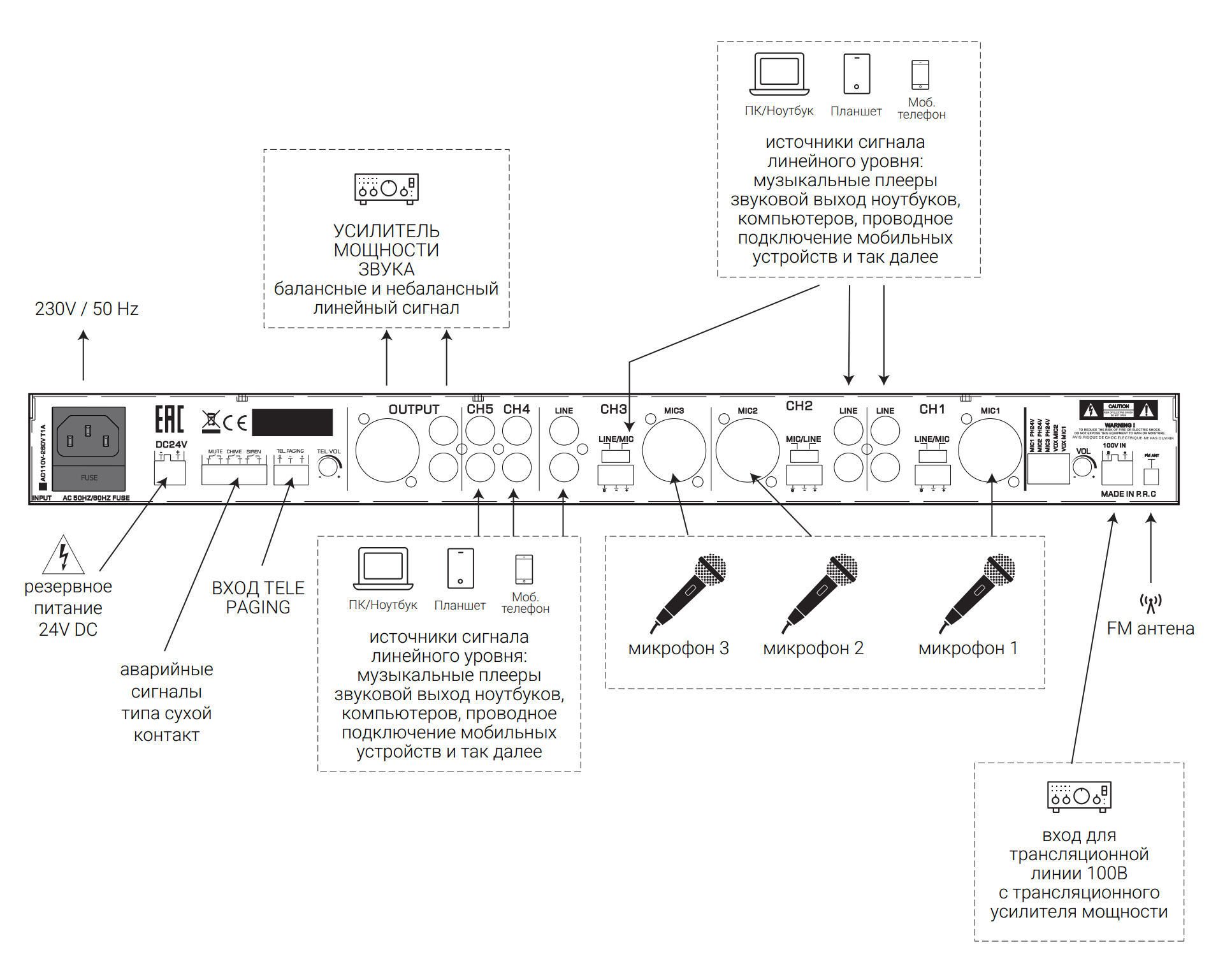 Профессиональное устройство, микширует сигналы с пяти входов на один стереовыход. Медиаплеер с цветным экраном и кнопками управления, источники: разъёмы USB и TF, Bluetooth 5.0, FM-тюнер. Частотный диапазон 80-20 000 Гц, сигнал/шум >75 дБ, THD <0,5%. Аудиовходы: 3 комбинированных, микрофонно-линейных (XLR/2RCA), с переключателями уровня, подключаемым фантомным питанием +48В и приоритетом у входов 1 и 2; два линейных (2RCA). Аудиовыход: 1 линейный, стереофонический (XLR/2RCA). Независимые регуляторы громкости для каждого входа, плеера и общий, двухполосный эквалайзер (НЧ+ВЧ). Управляющие разъемы типа "сухой контакт": MUTE (блокирует вещание), CHIME (сигнал Гонг), SIREN (сигнал Сирена). Дополнительные служебные входы: TEL.PAGING (Phoenix 3-pin) для интеграции усилителя в телефонную сеть и линейный вход 100V IN (Phoenix 2-pin); у каждого из доп.входов есть отдельный регулятор громкости. Активное интеллектуальное охлаждение. Защита от перегрева, КЗ и перегрузки на выходе. Габариты 485х44х340 мм (1U), вес 7 кг. Монтаж в рэковую стойку или настольный. Питание - основное от сети AC 220В с возможностью подключить резервное DC 24В/5А. Пульт ДУ.