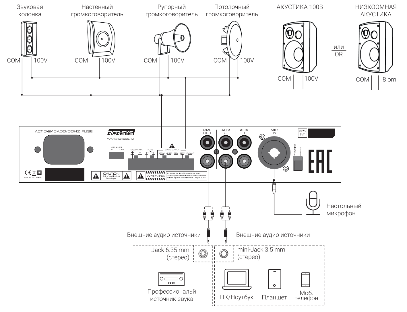 Усилитель имеет богатое оснащение различными разъёмами. Три аудиовхода: 2 линейных, разъемы 2RCA, и 1 микрофонный, универсальный и балансный, разъем XLR/TRS Jack 6,35 мм. Аудиовыходы: на акустику (70/100В и 4-16 Ом), разъем Euroblock и один линейный, Pre Out, разъемы 2RCA, для подключения внешних акустических приборов (усилитель, устройство записи и т.д.). Коннекторы размещены на тыльной части корпуса. Здесь же DIP-переключатели для микрофонного входа (подключаемые приоритет и фантомное питание +24В) и для ручной блокировки работы плеера, что актуально при эксплуатации в местах, где нельзя произвольно менять звуковое сопровождение. Есть управляющий разъем типа "сухой контакт", при поступлении сигнала на который блокируется вещание, кроме приоритетного микрофона (если подключена данная опция). Дистанционное управление реализовано с помощью инфракрасного пульта.