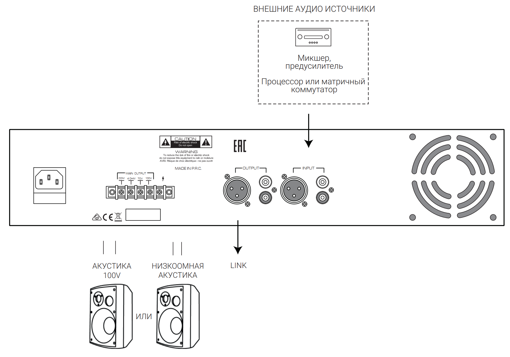 Схема подключения одноканальных усилителей RORSYS серии PA-1xxxP